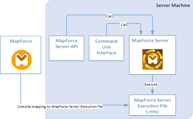 On the Windows machine where MapForce runs, compile the mapping to a MapForce Server Execution File (.mfx). The .mfx files are in fact data mappings packaged for execution in a server environment. You can copy such files to any of the supported operating systems where MapForce Server runs (including across different platforms, see System Requirements). On the server machine, you can execute the .mfx file using the command line interface of MapForce Server, or using the MapForce Server API.