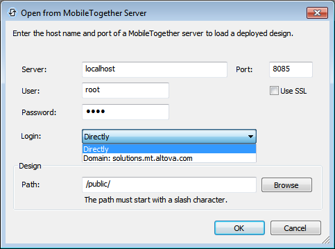 •Server name and port: The port refers to the MobileTogether Server administrator port and must match the Administrator Port setting of MobileTogether Server. If you use SSL, make sure that you use the secure port of MobileTogether Server. •User name and password: The user name and password of a user that has been given the privilege Open workflow from designer. MobileTogether Server users and their privileges are specified in the Users and Roles settings of MobileTogether Server. •Login: Specify whether login is direct or as a domain user. (If login is as a domain user, then the domain-specific user name and password can be used.) From the options in the combo box, select Directly or the domain you wish to use. Only those domains are displayed in the combo box that have been configured on the server for active directory login. For more information about configuring the server for active directory login, see the MobileTogether Server user manual. •Path and name of solution (design): The path and name of the deployed solution. Click Browse to browse through all deployed solutions on MobileTogether Server.