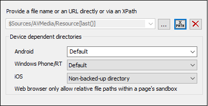 •Audio File: Click the Additional Dialog button to specify the audio file to play. The setting can be a URL or a relative file path, and can be either a static value or be located or generated by means of an XPath expression. Relative file paths are used to locate files that are stored on the mobile device. They are resolved relative to the base directory you specify for that device type (see screenshot below). For information on audio file formats, see Audio/Video Formats.