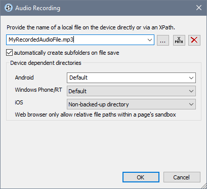 For the Audio File setting, provide the relative path and name of the client-device file in which you want to save the recording. Do this by either entering the file path directly or selecting the file path via an XPath expression. The file path you provide will be resolved relative to the base directory you specify for that device type (see screenshot below). If the path contains folders that do not exist, you can check the option to automatically create missing sub-folders (see screenshot below). For information about audio file formats, see the section Audio/Video Formats.