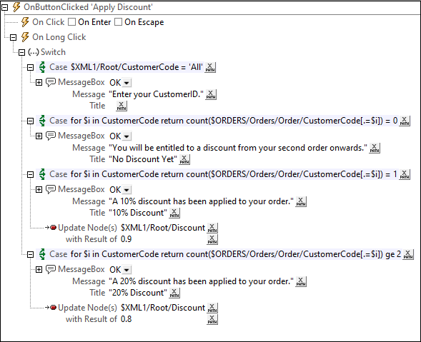 •The first Case action tests whether the content of the $XML1/Root/CustomerCode node is the string All.