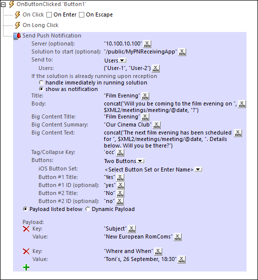 If this option is not specified, then, on the receiving device, the same solution as the sending solution is started when the PN is received. If the receiving solution is different than the sending solution, then the receiving solution is specified in this setting. The setting's XPath expression must resolve to a string that is the path to the solution's workflow on the server. In the screenshot above, for example, the receiving solution is MyPNReceivingApp, which is located in the public container on the server with the IP address 10.100.10.100.