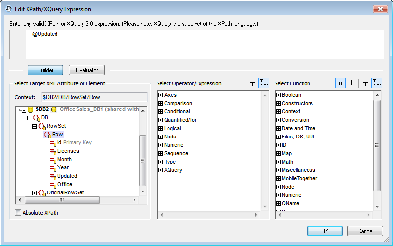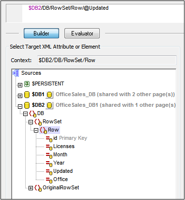 •If the XPath expression were changed so that it addressed the @Updated node starting from the root node (like this, and as in the screenshot below: $DB2/DB/RowSet/Row/@Updated), then the @Updated node of all Row elements would be updated.
