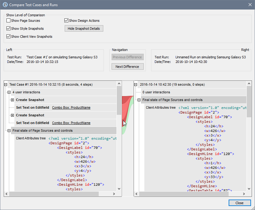You can compare a test run with its originating test case to see differences in their steps, actions, page source data, styles, and client views (the layout coordinates of design components in specific clients). In the Manage Test Cases and Runs dialog, select the two test runs that you want to compare, and click Compare Checked. The Compare Test Cases and Runs dialog (screenshot below) is displayed.