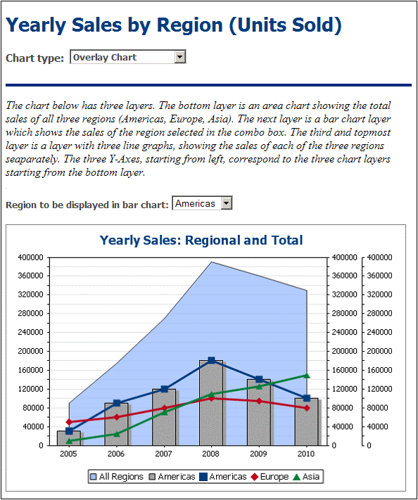 You should note that when a layer is placed over another, it will obscure the layers beneath it. Since only area charts can be made transparent, some layer arrangements might not be optimal. For example a bar chart that is layered over a line chart would obscure parts of the lines. You should keep this in mind when planning the layering order.