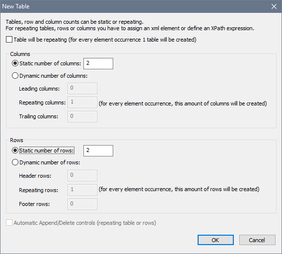 You can insert tables into your design by dropping the Table control at the location where you want the table. For each Table control, one table is created. When you drop the control, the New Table dialog (screenshot below) appears. Here you can specify the table's type and whether the table should have a header and/or footer.