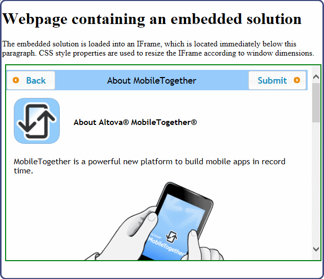 An embedded webpage solution is a solution that is embedded in a webpage. In effect, the HTML code of the webpage will contain an IFrame element, into which the solution is loaded. Data can be exchanged between the webpage and its embedded solution with the use of JavaScript. The solution itself interacts with MobileTogether Server in the usual way, and receives data from MobileTogether Server that can then be communicated back to the webpage via JavaScript mechanisms.