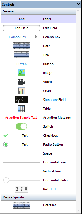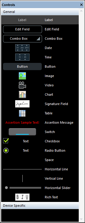 The pane's controls are organized into a General section and a Device-Specific section. To add a control to a page design, drag and drop the control onto the desired location in the page design.