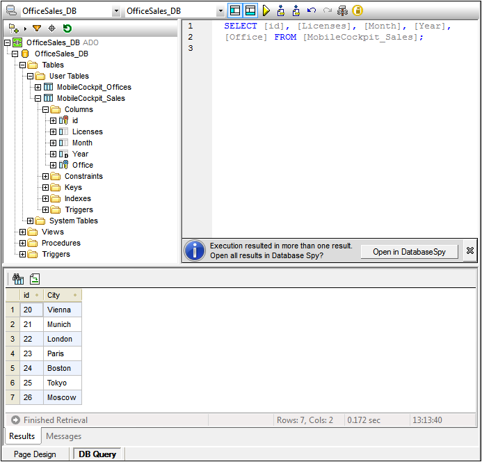 The DB Query View (screenshot below) enables you to directly query any major database from within the MobileTogether Designer GUI. The database could be a page source referenced in the active document or an external database. Note that each DB Query pane is associated with the currently active design. You can have connections to multiple databases for a single design. There can also be multiple designs open in MobileTogether Designer. Queries and actions defined in the DB Query View are independent of other MobileTogether Designer tabs, and are not saved as part of the .mtd design file.