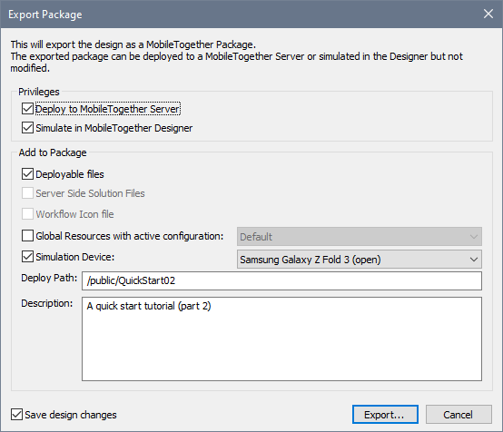 •Privileges: Will the package be used for deployment, for simulations, or both. See MobileTogether Packages for more information.