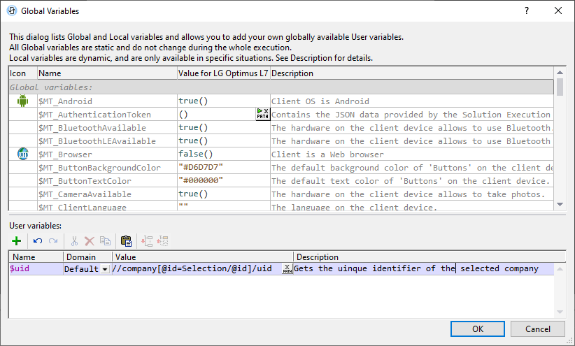 •Static-value variables (called Global Variables in the dialog): These variables contain information about the mobile device. Values of these variables do not change during the execution of the project. Notice that the Value column in the upper pane specifies the currently selected mobile device. The listed values are for that particular device. For simulations, the client device is considered to be the device selected in the Device Selector combo box. For example, the variable $MT_Android has a value of true when the mobile device being used is an Android. (Device information is sent by the device as part of standard mobile communication procedures.) •Dynamic-value variables (called Local Variables in the dialog): These variables contain information related to the design page and its controls. Their values could change during execution. For example, the $MT_ControlNode variable has different values according to which node is the page source link of the current control at a given time during project execution. •User variables: In addition to the standard library of global variables, you can add your own global variables (called User Variables in the dialog) in the lower pane of the dialog. You can give a user variable any value, and this value can then be used subsequently in any XPath/XQuery expression in the project.