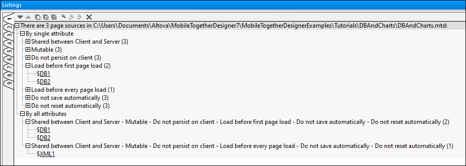 Returns a list, in the Listings Pane, of the current project's page sources, organized by page source attributes (that is, according to the values of the project's various settings). Two lists are returned.