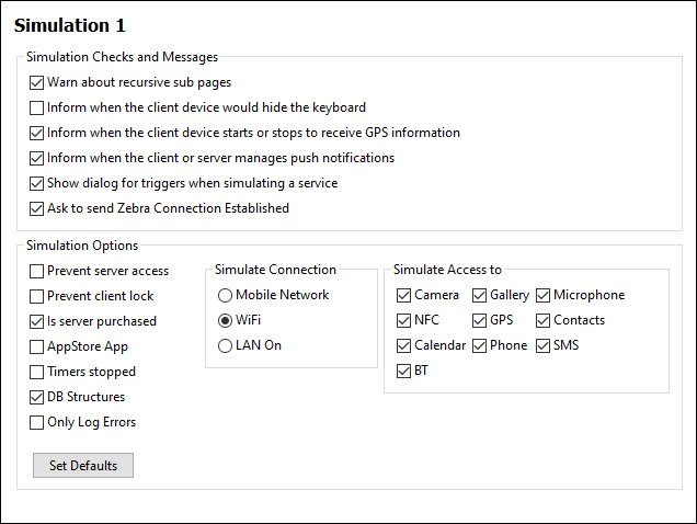 •Options: The settings you make here determine the default settings of the simulator. For example, you can set whether the simulator has access to the server or not, and whether a client lock should be prevented. You can also specify whether a WiFi, LAN, or mobile network connection is simulated when the simulator starts. By default, the Simulate WiFi option is on. (In the Simulator, you can change the options at any time.) The Set Defaults button resets the options to their original default settings. You can also simulate that certain client-side apps (like a camera or calendar) or functionality (such as Bluetooth (BT)) can be accessed. After the simulator is started, you can change these settings in the simulator's toolbar or its Simulation menu. To set default data sources for some of these simulated client-side apps, go to the Simulation 2 tab in this dialog.
