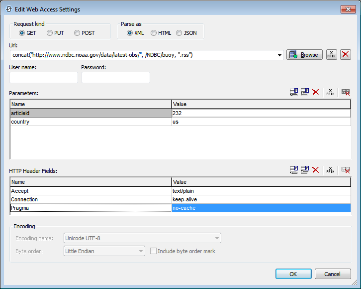 The settings for HTTP/FTP requests are defined in the Edit Web Access Settings dialog (screenshot below). Enter the request kind, the URL of the target resource, the data format of the target resource (XML, HTML, or JSON), user authentication information, and, optionally, query parameters and headers. In the screenshot below, for example, the GET request is composed using an XPath expression: It targets a .rss page on the http://www.ndbc.noaa.gov website. The name of the RSS page is taken from the /NDBC/buoy node, and the target page will be parsed as XML. Query parameters and headers can be added to the request. The charset header, however, is automatically generated by MobileTogether Designer and will not be overwritten by a charset header that you enter in this dialog.