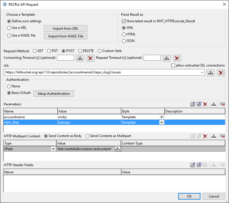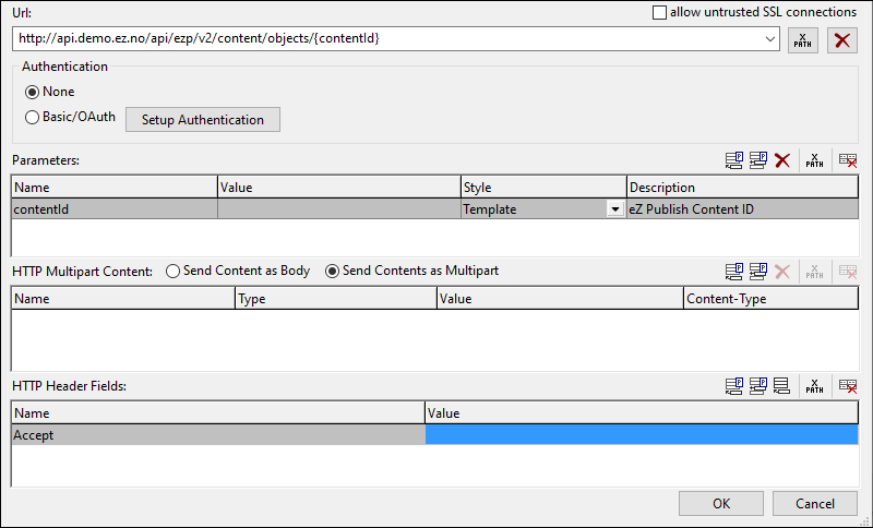 Select the method you wish to use, and click OK. The URL of the resource is entered in the URL field of the template, and the parameters, and HTTP content and headers defined in the WADL file for that resource are entered in the respective tables of the template (see screenshot below). In the template, you can enter the values of parameters and HTTP content and headers, but parameter names cannot be edited and parameters cannot be deleted.