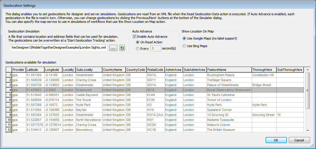 The Geolocation Settings dialog (screenshot below) enables you to specify geolocations from an XML file for designer and server simulations. You need to specify geolocations in this way because these simulations do not use a mobile device and therefore have no geolocation data available to them. These geolocations stand in for the actual geolocations of a mobile device.