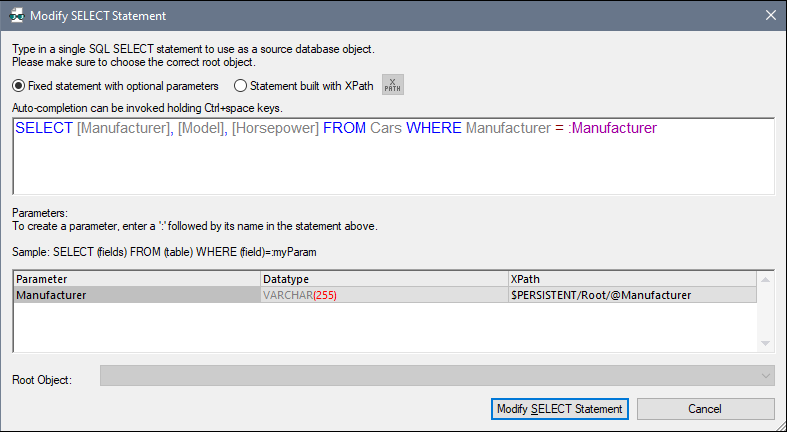 3.In the Modify SQL SELECT Statement dialog that appears, enter the following SELECT statement: SELECT [Manufacturer], [Model], [Horsepower] FROM Cars WHERE Manufacturer = :Manufacturer. This statement selects—and therefore loads—only the Manufacturer, Model, and Horsepower fields of those records where the Manufacturer field matches the value supplied by the :Manufacturer parameter. Since the SELECT statement contains a parameter (:Manufacturer), a line for the parameter definition will automatically be added to the lower pane of the dialog (see screenshot).