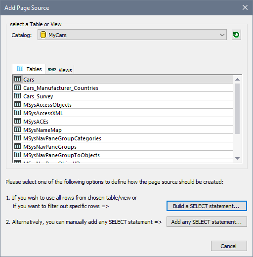 Select the Cars table as shown in the screenshot, and click Build a SELECT statement and then Finish.