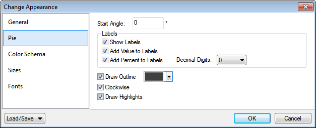 •In the Chart Configuration dialog, click All Settings. In the Change Appearance dialog that appears, select Pie and select Add Value to Labels and Add Percent to Labels.