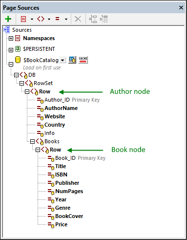 In the above tree, note that each Author node can have multiple Book child nodes—because multiple books can be related to one author (via the book's foreign key). The Book node in the page source represents all the books that can belong to the parent Author node. The Author node represents all the authors in the DB. In this way, the tree describes a structure of Author nodes with their respective Book children.