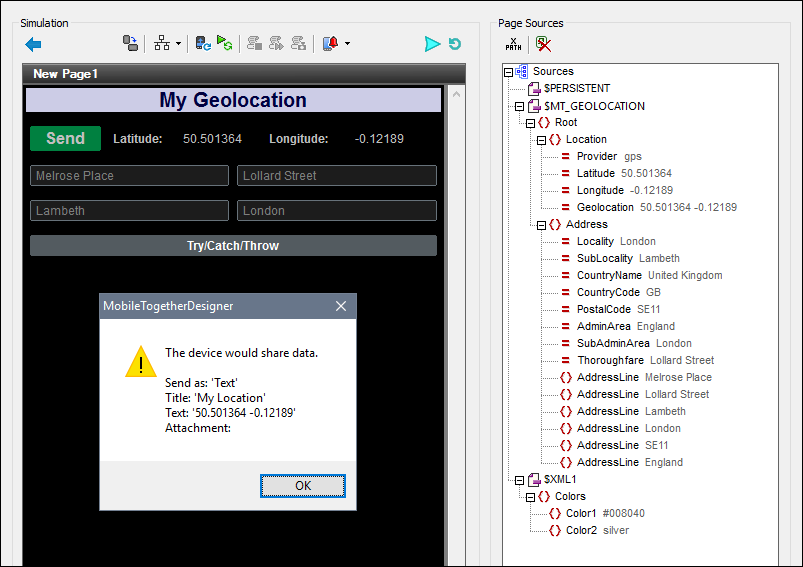 •SharingGeolocations.mtd: This is the completed MobileTogether design file. Open this file and refer to it while reading this tutorial. You can run a simulation in MobileTogether Designer by pressing F5.