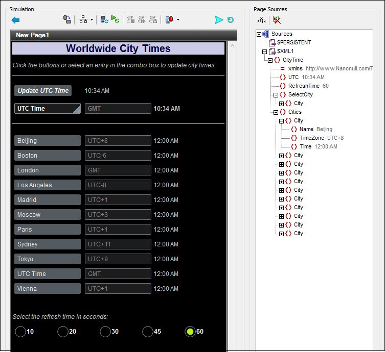 Press F5 to run a simulation in MobileTogether Designer. The timer for the page-refresh will be started with a value that is taken from the $XML1/CityTime/RefreshTime node. This is 60 (seconds) in the original data tree.