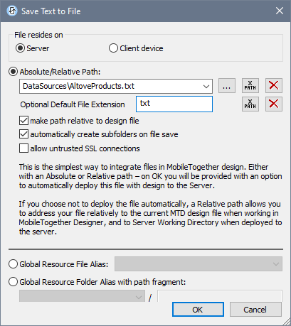 •Absolute/Relative Path: You can enter a path, browse for a file, or enter an XPath expression that generates the path to the file. Use the Reset button to remove the current entry. The path can be relative to the design file, or absolute. If the file is deployed to the server along with the design file, then the relative/absolute path specified in the dialog will be used internally (in the server's database) to access the file. If the file is not deployed, then it must be stored in a directory on the server. In this case: (i) if a relative path is selected in the Load From or Save/Specify File dialog, then, at runtime, this relative path will be resolved on the server with reference to the Working Directory (defined in the MobileTogether Server settings); (ii) if the path in the Load From or Save/Specify File dialog is absolute, the file's containing folder on the server must be a descendant of the Working Directory. See the section Location of Project Files for details. You can also choose whether to allow untrusted SSL connections or not, when accessing or saving the file. If the Absolute/Relative Path field is in a dialog to save a file—and not to load a file—you can optionally specify a default file extension; this extension will be used if none is specified with the file name.