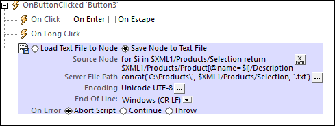 Saves data from the selected page source node to the text file specified in the File Path field (see screenshot below). The encoding and end-of-line characters of the text file are specified, respectively, in the Encoding and End of Line fields.