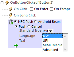 The NFC Push option enables you to define the NFC message that you want to transmit. In the combo box (see screenshot below), select the Standard Type of the message to be transmitted. These types are as defined in the NFC technical specifications.