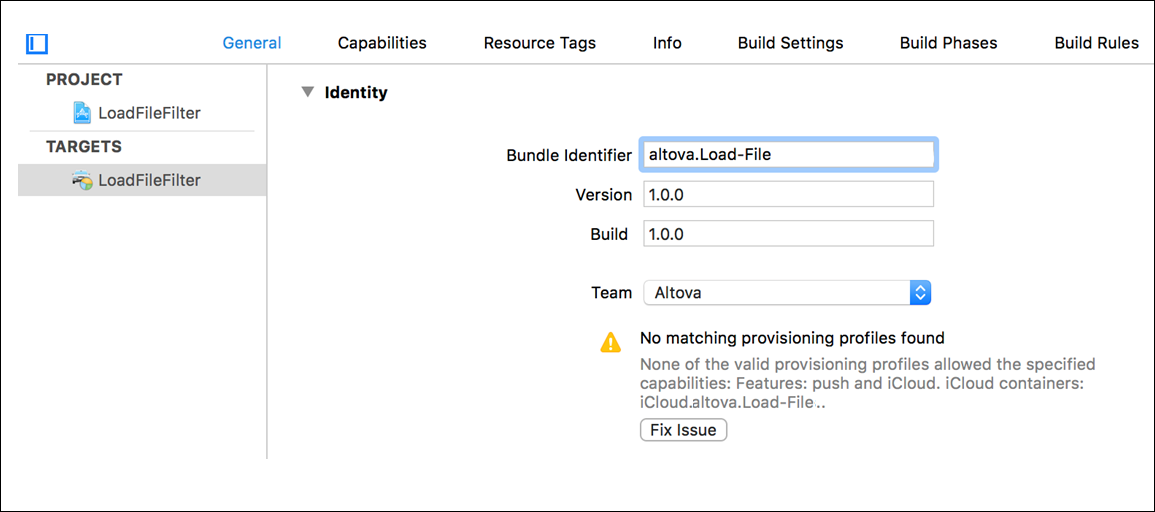 1.In XCode, click the General tab (see screenshot below). You will see a message saying that a provisioning file is missing.