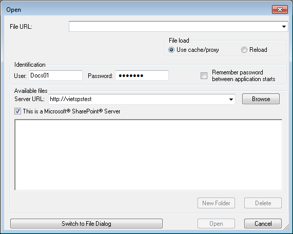 •The Browse function is only available on servers which support WebDAV and on Microsoft SharePoint Servers. The supported protocols are FTP, HTTP, and HTTPS. •To give you more control over the loading process when opening a file, you can choose to load the file through the local cache or a proxy server (which considerably speeds up the process if the file has been loaded before). Alternatively, you may want to reload the file if you are working, say, with an electronic publishing or database system; select the Reload option in this case.