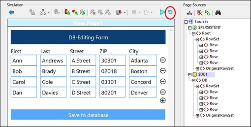 The example solution 04-EditRecords.mtd (design shown in screenshot below) displays the DB data in a table and allows users to edit the data. Fields of the table are linked to the \$PERSISTENT page source. This means (i) that it is the contents of \$PERSISTENT that are displayed in the table, and (ii) that edits you make in the table are stored in \$PERSISTENT.