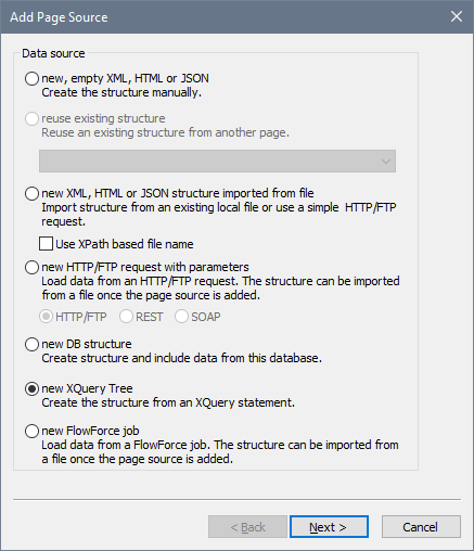 To add an XQuery page source, do the following: In the first screen of the Add Page Source dialog (see screenshot below), select New XQuery Tree.