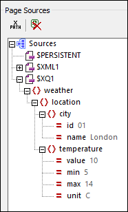 If you want to use nodes from the \$XQ tree in the design, you can locate them via XPath expressions (for example, like this: \$XQ1/weather/location/city/@name). Alternatively, you can construct a temporary tree in the Page Sources pane that matches the structure of the tree that will be created by the XQuery statement (see screenshot below); you can then drag nodes from the tree into the design. Note that the actual creation and loading of data into the tree will be according to the XQuery page source's Load Data option that you selected (On First Use, On Every Page, or Not Automatically).