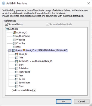 4.In the Add/Edit Relations dialog that appears (screenshot below right), select the Books table, which is hierarchically linked to Authors via its foreign-key column AuthorID.