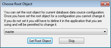 5.Select the root object: If you connect to a database server where a root object can be selected, you will be prompted, in the Choose Root Object dialog (screenshot below), to select a root object on the server. Select the root object and click Set Root Object. The root object you select will be the root object that is loaded when this configuration is used.