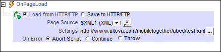 For each LoadFromHTTP/FTP action, you can select one page source from the available page sources and specify an HTTP/FTP source from which to load data. (Alternatively, you can use an XPath expression that locates the root node of the page source (for example: $XML1).) When the event is triggered, data from the HTTP/FTP source will be loaded into the page source you have specified. To load data for multiple page sources, add multiple LoadFromHTTP/FTP actions.