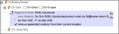 The new node/s are appended as the first or last child node/s of the node/s returned by the XPath expression for this setting (Append to Node). In the screenshot above, the new node/s are appended as the last child nodes of the context node, the Products element (selected with the XPath expression current()). To select whether the new node/s should be appended as the first or last child node/s, select the appropriate radio button in the action's definition.