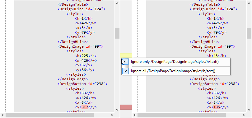 •Ignore specified page source or snapshot data nodes for differences. In the column between the two panes, right-click a difference connector and select Ignore only <this node> or Ignore all <these nodes> (see screenshot below). Ignored nodes are highlighted in yellow. These nodes will be ignored as differences in future playbacks. To consider differences in these nodes again, deselect Ignore only <this node> or Ignore all <these nodes>.