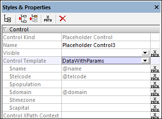 2.Go to the Styles & Properties Pane and make sure that the Placeholder Control's Control Template property is correctly set to the name of the control template that you want to insert. (In the screenshot below, the selected control template is DataWithParams; it is selected from a dropdown that lists all the control templates in the design.) Alternatively, you can use an XPath expression to select a control template. Such an XPath expression must evaluate to the name of a control template in the design. Using XPath expressions enables you to select templates conditionally. See Example Projects for ways to do this.
