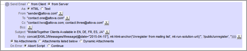 The Send Email To action enables emails to be sent from the client and server. If an email is sent as HTML, you can add a hyperlink to the body of the email. The link can open a MobileTogether solution. To add a link to the email body, use the mt-html-anchor function in the XPath expression of the Body option (see screenshot below).