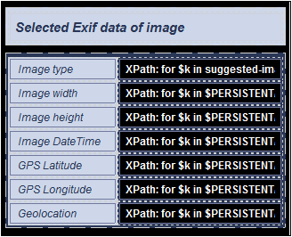 •The table's first column contains the index position of the current attribute: index-of(../@*/name(), ./name() ) •The second column contains the name of the current attribute: name(.) •The third column contains the value of the current attribute: current() •Not all images contain the same Exif metadata. In some cases, some metadata may be absent; in other cases, additional metadata might be present; in still other cases, metadata might be tagged with non-standard, vendor-specific tags. Consequently, knowing what metadata is available and under what attribute names is important. Only with this information can specific attribute values be retrieved. •If we know the names of the attributes that are returned, we can access its value by using the image-exif-data function like this: image-exif-data(Base64String)/@WantedAttribute. Note that the function returns the Exif element.