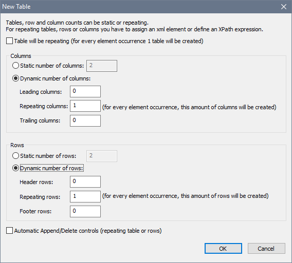 Drag a table control into the design and drop it at the location where you want to create it. In the New Table dialog (screenshot below), select the options for dynamic rows and dynamic columns. Select the number of rows and columns that should be repeated for each instance of the element that, respectively, corresponds to the row and column. Leading/Trailing columns correspond to Header/Footer rows. Note that you can add Append/Delete controls for dynamic rows, but not for dynamic columns.