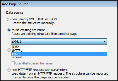 The structure and data of a page's page sources (see screenshot below left) are available to controls placed on that page—and that page only. However, a single page source can be reused among multiple pages, enabling the source's data to be accessed on multiple pages of the project. To reuse a page source on another page, create it there as a page source that reuses an existing structure (see screenshot below right).