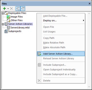 1.In the Files Pane, right-click the server action libraries item to access its context menu and select Add server action library (see screenshot below). Alternatively, use the menu command Refactor | Add server action library.