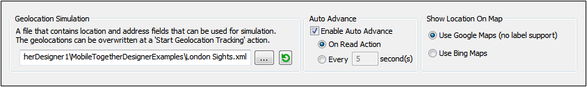 •Auto Advance: If Auto Advance is enabled, each geolocation in the XML file is read in turn during simulation. You can specify the time interval between the reading of each geolocation. If Auto Advance is not specified, you can change geolocations during simulation by clicking the Previous or Next buttons at the bottom left of the Simulator dialog. Note that these geolocation values run in the simulator only. They are passed to page source tree nodes (including the $GEOLOCTION tree) only when such an action is explicitly specified in the design.