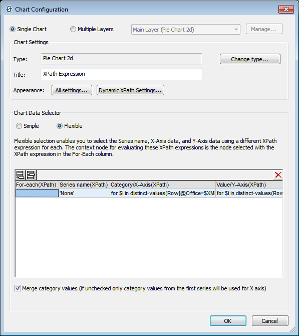 For pie charts, we need two series (for the X and Y axes). The Flexible option is ideal for defining the axes for two series. The For-each setting selects the current node (RowSet). We define the following XPath expressions for the two axes: