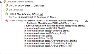 The search is started when the Find button is clicked. The actions of the button's OnClicked event (screenshot below) are (i) a Reload of the $BookCatalog page source and (ii) a Delete Node(s) action. Both actions are described in detail below. For the moment, it is important to know that the Reload action for the $BookCatalog page source starts the search in the DB. See the next section, SQL Search of the DB. The Delete Node(s) action is described in the section Removing Non-matched Books below