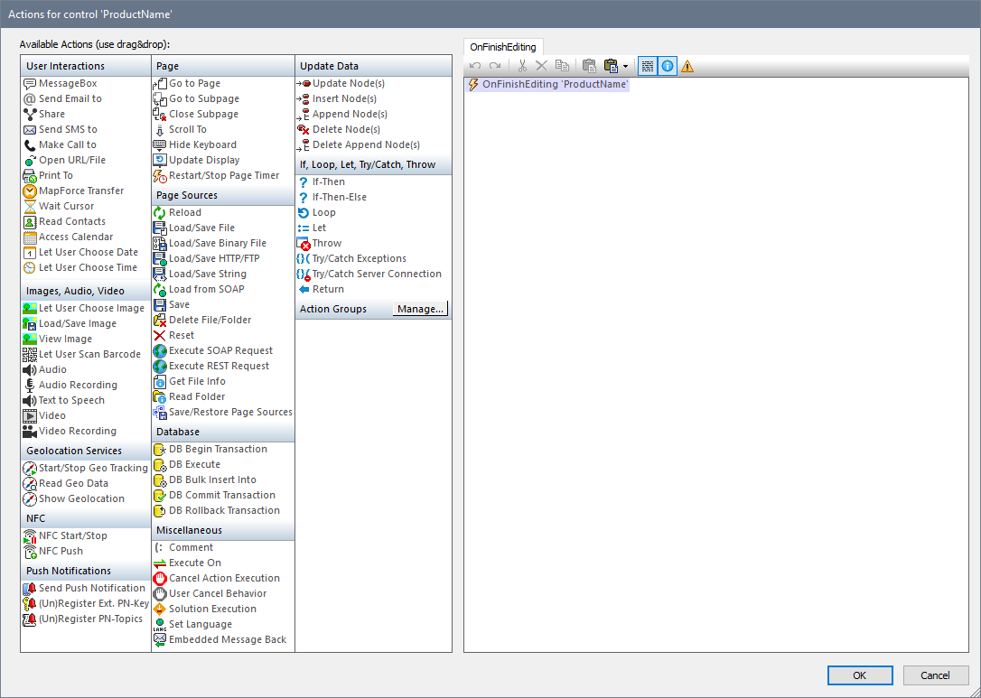 1.Right-click the XML:Product combo box and select Control Actions on OnFinishEditing. This opens the Control Actions dialog for the combo box (screenshot below). There is only one combo box event: OnFinishEditing (see the right-hand-side pane). If additional events were available they would be shown as additional tabs of the right-hand pane. All the available actions for events are listed, in groups, in the left-hand-side pane.