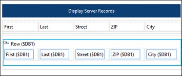 Notice in the screenshots of the designs that the cells of the table in 02-DisplayRecords.mtd (2) are linked to the $DB1 page source (screenshot below left), whereas the cells of the table in 03-DisplayOnDemand.mtd (3), are linked to the $PERSISTENT page source (screenshot below right). These page sources—to $DB1 (the page source linked to the database on the server) and $PERSISTENT (the page source on the client)—cause data from the respective page sources to be displayed in the table.